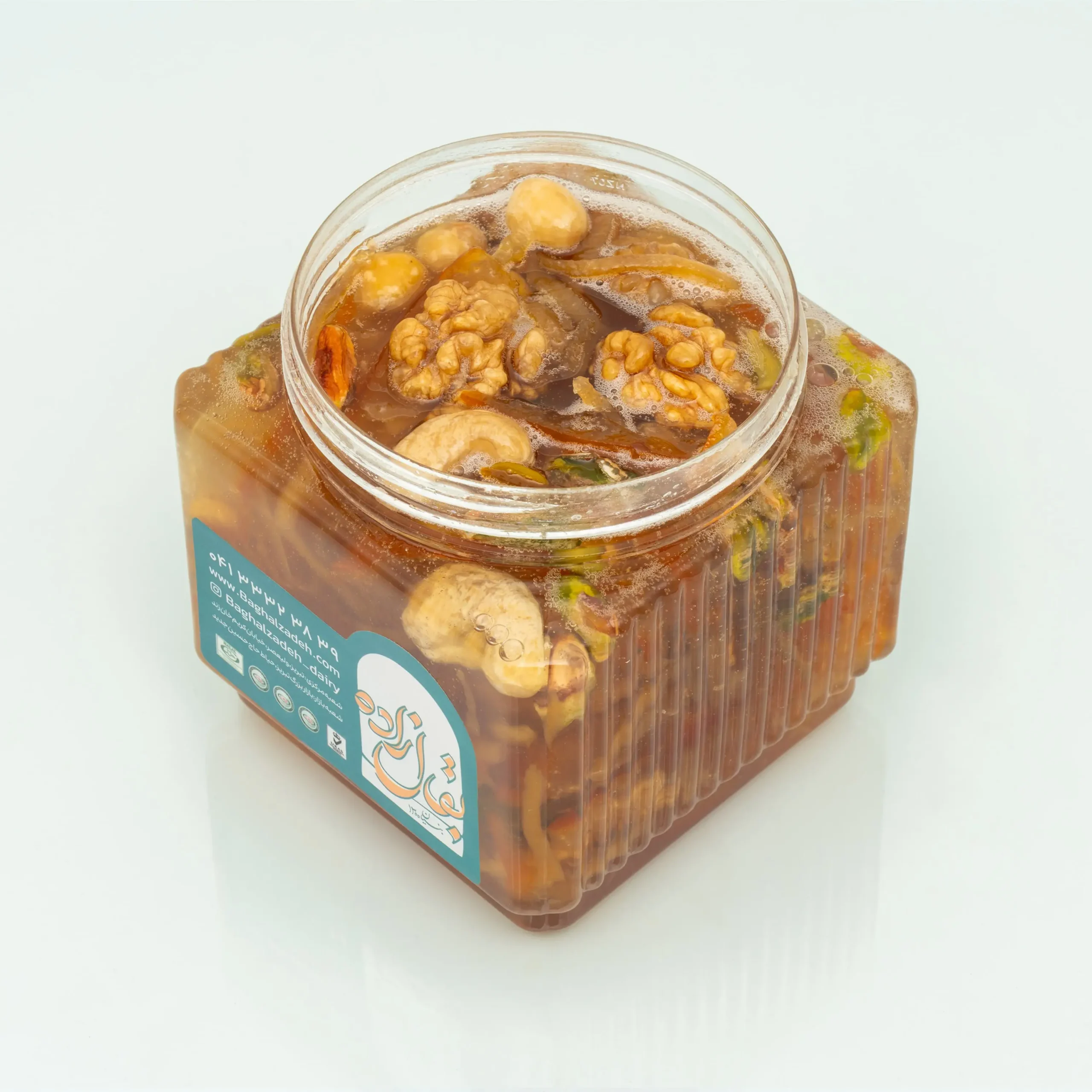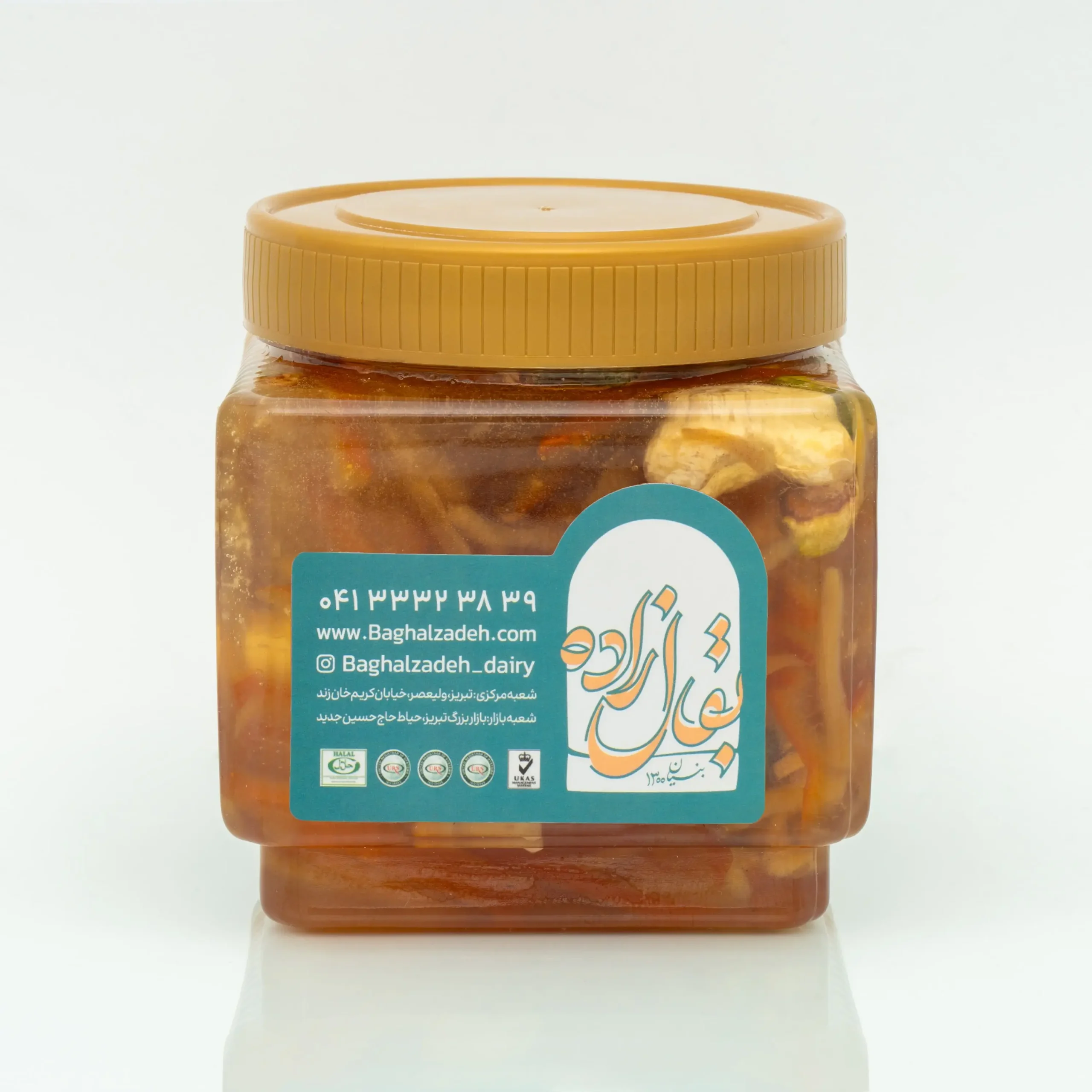در تهیه مربا آجیل بقال زاده، خبری از مواد نگهدارنده یا افزودنی های شیمیایی نیست. ما به سلامت شما اهمیت می دهیم و تنها از مواد کاملاً طبیعی و ارگانیک استفاده می کنیم. این محصول سرشار از ویتامین ها، مواد معدنی و آنتی اکسیدان هایی است که از میوه ها و مغزهای موجود در آن نشات می گیرد. وقتی صحبت از خرید مربا آجیل می شود، انتخاب محصولی با ترکیبات طبیعی، اولویت هر خانواده ای است. این مربا می تواند یک منبع عالی برای تقویت سیستم ایمنی و افزایش انرژی روزانه شما باشد.